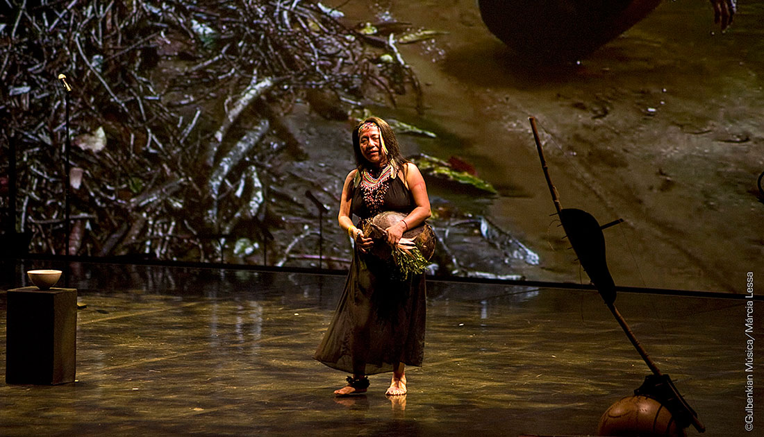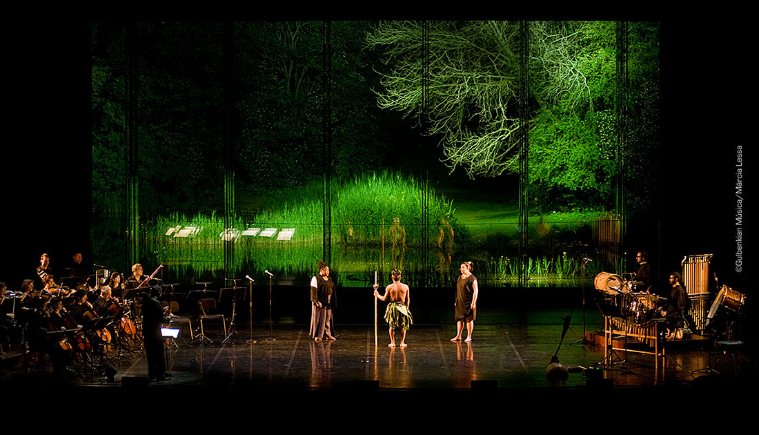 a multimedia opera sung through the stories of people living in the rain forests of the Amazon.