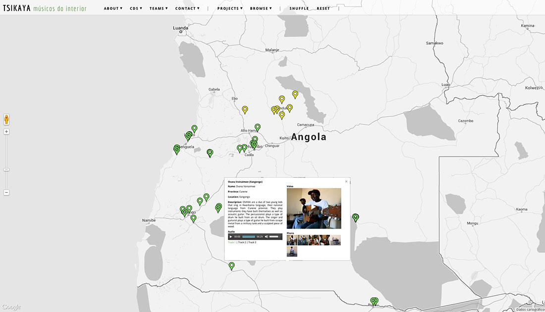 Field recordings are regularly performed by local teams in each province contributing to a growing digital archive of traditional as well as contemporary music. Tsikaya has taken place in the provinces of Cuando-Cubango, Benguela, Huíla, Cunene and Huambo and aims at covering the whole national territory.